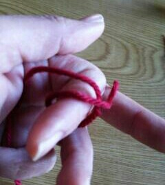 えーまず、こんな風に人差し指に時計回りに糸を一巻きしてループにします。