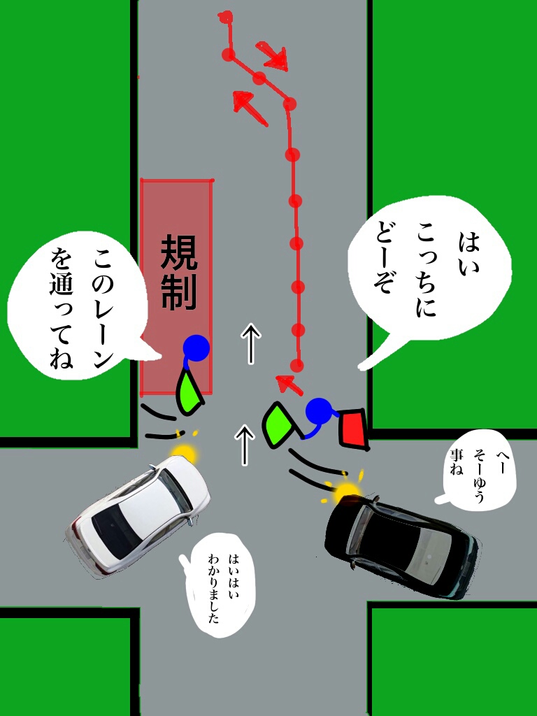 で、見かねた私が規制の真ん中あたりに立って、Gさんの方から来る車を軌道修正したりしてると